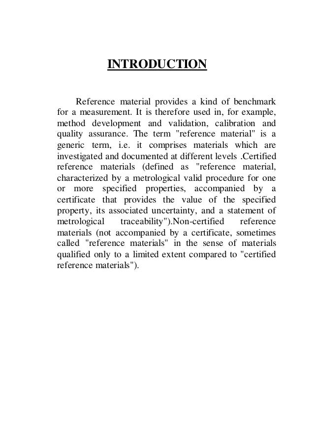 Jctlm working group for traceability: The use of reference material is recommended to verify the correct function of the particle sizing many vendors supply certified reference materials which either address a single or a group of. I've got better reference materials for your demon at home sir, here are the reference materials you requested Certified reference materials (crms) are 'controls' or standards used to check the quality and metrological traceability of products, to validate analytical measurement methods, or for the calibration of instruments. 4.2 selected human biospecimen examples of reference materials.